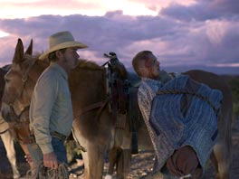テキサスはメキシコとの国境の街での話。 密入国者のメルキアデス(フリオ・セサール・セディージョ)は、気の良いカーボーイで、年齢は離れているが、ピート(トミー・リー・ジョーンズ)の大の友達だった。 その友達が国境警備員のマイク(バリー・ペッパー)に殺される。 警察は犯人が分かってながら、身内の国境警備をかばって逮捕しようとしなかった。 ピートは警察に抗議したが、受け入れられなかった。 切れた彼は、マイクを拉致する。 そして、メルキアデスとの約束を守るべく、墓場から彼の遺体を掘り出して、メキシコの村に届けようとする。 話はただそれだけである。 もちろんマイクだって従順に従うわけではないし、警察や国境警備隊も追ってくるし、何よりもメキシコへの道が険しいのだ。 険しい山を越えてメキシコへと密出国をはかる。 途中で、荷物を載せた馬が崖から落ちたり、マイクがガラガラヘビにかまれたり、 砂漠で落馬して馬の下敷きになったりと、大変な道中である。 この映画は、ピートが約束を果たすべく、ここに至るまでの描写が、実に自然である。 ある時、メルキアデスは女性の写った一枚の写真を見せて、 自分が死んだら故郷の村ヒメネスに、埋葬して欲しいという。 年寄りのピートは、自分のほうが先に死ぬと、若者の話を冗談に受け止めていたが、 死んでしまった以上、彼との約束を果たそうとする。 死んだ友達との約束など、男のセンチメンタリズムに過ぎず、現代社会ではむしろ愚かな仕儀に見えるかも知れない。 しかし、ピートはそう考えない。 友達とは、年齢や国籍も関係ない。 心が通っていれば、大切な友人なのだ。 ピートは決して真面目な男ではない。 中年の人妻ウエイトレスのレイチェル(メリッサ・レオ)とベッドをともにしているし、 メルキアデスには若い人妻ルー(ジャニュアリー・ジョーンズ)とのアバンチュールをさせている。 道徳的な男より、チョイ悪な不良のほうが魅力がある。 メルキアデスは密入国者だから、入国管理局の眼を恐れて、おおぴらに街を歩くことはできない。 その彼に女性を紹介するのだ。 同じモーテルの隣の部屋で、2人はことに及んでいる。 こうした不良的な仲が、男の友達意識を形成する。 メルキアデスが密入国者であれば、彼を思う人はほとんどいないので、2人の関係は密なものになっていったのだ。 そのあたりの描写も上手い。 そのため、小さな街での人間模様が、くっきりと浮き上がっている。 レイチェルはベルモント警察官(ドワイト・ヨーカム)とも、ベッドをともにしているのも、 まったく憎めないし納得できてしまう。 そして偶然にも、ルーはマイクの奥さんなのだが、この偶然は物語のなかでは自然に消化されている。 レイチェルのベッドシーンでは、中年の彼女が全裸を披露している。 彼女のしなびた乳房や入れ墨が、いかにもアメリカの田舎の女性という感じを与え、上手い演出である。 話自体は単純なので、 主題を支えるエピソードをきっちりと描き込んでこないと、物語が嘘っぽくなってしまう。 しかし、メキシコへと向かう前の描写が、充分に描き込まれているので、 その後の厳しい国境越えが素直に感じる。 メキシコへの途中では、盲目の男性や薬草を知る女性や、 猟に来ていたメキシコ人男性たちを登場させているが、こうした人物たちが実に自然である。 しかも、彼(女)らの登場が、物語の展開に必要不可欠の役割を果たしいる。 メキシコ人の古き良き時代的な人の良さが、こうしたエピソードをとおして伝わってくる。 物語は時間を前後させて進むから、 エピソードをきちんと組み立てておかないと、観客は理解不能になる。 この映画は、物語がとても緻密に構成されているので、時間が前後しても充分に理解できる。 すべてのエピソードが、必要にして充分である。 そして、登場人物の性格設定がいかにも居そうな人たちで、しかも、彼等の性格が物語の展開に必然性を与えている。 メルキアデスの話は、ほとんど嘘だったのだ。 ピートは辛うじて村のような遺跡を見つけ、そこがヒメネスという村だと決める。 そこに彼の遺体を埋葬し、マイクを解放して映画が終わる。 トミー・リー・ジョーンズはこの映画の主題、 つまり死んだ男との約束を守ることは、時代錯誤だと知っている。 だから、ヒメネスという村を存在させなかったのだ。 そして、メキシコからレイチェルに電話でプロポーズして、あっさりと断られるのも、 彼の認識が現実離れしていることを表現している。 浮気するのは構わないが、安定した生活を捨てるのは、女性にとってはとんでもないことだ。 彼は現実離れしており、時代錯誤だと知っていながら、 約束は約束だという精神性を頑固に守っている。 近代的なアメリカ人たちの日々は殺伐としているが、遅れているメキシコ人のほうが豊である。 しかし、良くあるように前近代を賛美するのではない。 彼はアメリカ人とメキシコ人を、まった