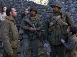 アメリカ陸軍の黒人中隊が、前線を進軍している。 ドイツ軍と近いので、兵士たちは緊張している。 川に近づいて渡渉を始める。 そこで敵の攻撃にあい、無線で後方の友軍に爆撃を求める。 しかし、黒人差別に凝り固まった司令官は、黒人部隊が進軍するはずがないと考え、わざと攻撃目標を違えて黒人たち味方を爆撃する。 戦線が分断されて、4人だけが川の向こうに取り残され、他はすべて戦死してしまう。 黒人兵たちは川の向こうで、はぐれた少年とであう。 4人の兵隊ビショップ(マイケル・イーリー)、トレイン(オマー・ベンソン・ミラー)、スタンプ(デレク・ルーク)、ヘクター(ラズ・アロンソ)と、アンジェロ少年(マッテオ・シャボルディ)は、トスカーナ地方の小さな村へとすすむ。 この村にはファシスト支持者もいたが、パルチザンの拠点でもあり、反ドイツ感情が強かった。 戦線を越えてしまったので、黒人兵たちは本隊に戻れず、村での生活が始まる。 ここには黒人差別意識がなく、村人たちはアメリカの黒人兵に親近感をもち、じょじょに心が通いはじめた。 少しおつむの弱いトレインだが、アンジェロ少年から慕われ、少年は彼の手からしか薬をのまない。 トレインはイタリアの彫像の首を、肌身離さずに持っており、それが幸運を呼んでいた。 4人のなかでスタンプとビショップが、美しい女性レナタ(ヴァレンティナ・セルヴィ)に心を寄せる。 すると、ドイツ人捕虜を確保せよと命令を受ける。 パルチザンたちがドイツ人を捕まえてくる。本隊から捕虜の引き取りにくる。 しかし、ドイツ軍は近くに迫り、パルチザンの中から裏切り者がでて、村が攻撃される。 優勢のドイツ軍に、村は陥落するが、すぐにアメリカ軍が奪還する。 そのため、かろうじてヘクターだけが生き残る。 そして、帰国した彼は郵便局員となって、冒頭へと続いていく。 殺されたのは、黒人たちを見殺しにした司令官だったのだ。 もちろん殺したので、裁判にかかるが、成長したアンジェロ少年が彼を助ける。 どこまでが事実で、どこまでがフィクションか、ちょっと判断がつきにくい。 トスカーナ地方で黒人部隊が、闘ったことは事実だろうし、40年後に殺人事件があったことも事実だろう。 しかし、イタリアの彫像の首を、持ち帰ったのは事実だろうか。 この映画が描くのは、人種差別である。 1944年の米国では、まだ公民権運動もなく、黒人たちは厳しい差別にあっていた。 黒人はアメリカ人ではないかのごとくに扱われていた。 にもかかわらず、黒人たちも戦場に出た。 そして、黒人差別にあって、味方に殺されてしまう。 ところが、イタリア人たちは黒人差別を知らなかった。 村人は4人を受け入れたし、ビショップはレナタと結ばれさえする。 彼等はアメリカのために闘っていながら、祖国は自分たちを差部して、人間扱いしない。 そうした祖国だが、彼等は国のために命を落とす。 何ともやるせない話である。不条理ともいうべき人間を、少年を助けたドイツ兵や、裏切ったパルチザンなどで描く。 原題は「Miracle at St. Anna」 2008年アメリカ、イタリア映画 |